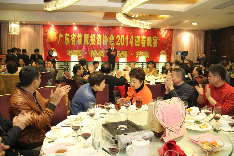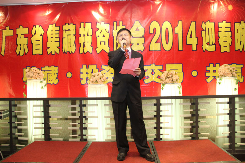 2014年1月6日晚六点,广东省集藏投资协会迎春晚会在广州美国银行中心二楼隆重举行。晚会节目精彩纷呈,现场气氛活跃。当晚,广东省集藏投资协会会长江则昊做完新年致辞后,进行了副会长、秘书长、副秘书长以及协会理事成员聘书颁发仪式。晚会节目安排了变脸艺术表演,魔术以及喜庆的歌曲表演,大家欢聚一堂,其乐融融。穿插其间的抽奖活动,更是高潮迭起。奖品设有高档燕窝、精品皮具、金银币,纸币,荷花钞、32连一美元炮筒以及最为吸引人的1990版一百元四方连的连体钞。